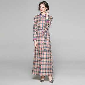 2022春季跨境女装欧美 翻领长袖格子系带单排扣长...