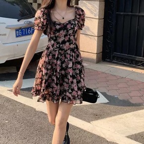 法式碎花方领收腰显瘦连衣裙女夏季2022茶歇裙初恋...