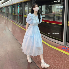 可盐可甜美蓝色泡泡袖连衣裙子女超仙森系设计感法式初...