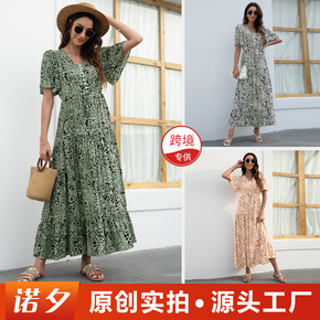 跨境女装独立站亚马逊爆款短袖沙滩度假大摆裙印花长裙...