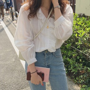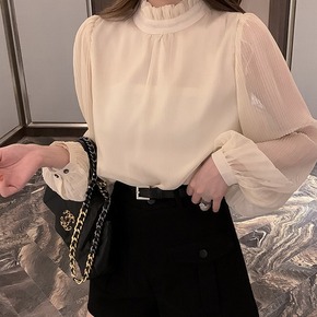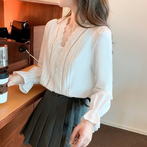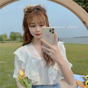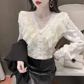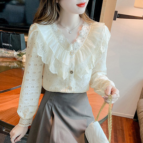 2022春季新款很仙的荷叶边蕾丝女士打底衬衫甜美别...