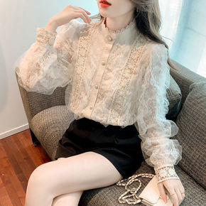 温柔风蕾丝衬衫女2022春装新款宽松立领气质仙镂空...