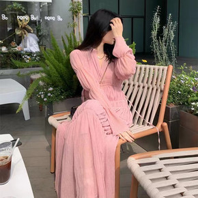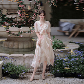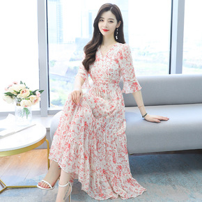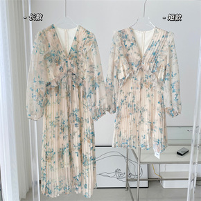2022夏装新款雪纺收腰仙女长裙气质复古碎花大摆超...