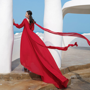 三亚泰国沙滩裙超仙沙漠度假旅拍红色连衣裙女大摆拖尾...