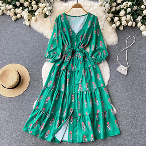 2022纯欲风吊带裙绿色碎花连衣裙雪纺长裙修身气质...