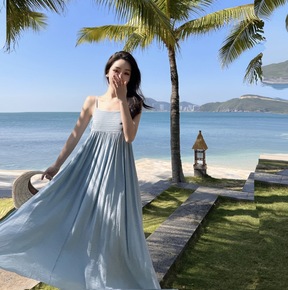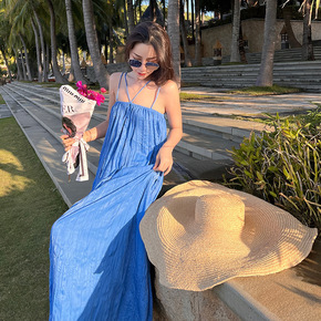 2022三亚度假连衣裙海边拍照吊带裙无袖露背蓝色长...