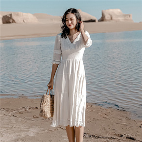 白色a字连衣裙女夏仙女裙流苏显瘦v领中长款温柔裙超...