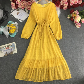 女装新款长袖圆领蕾丝拼接网纱连衣裙高腰修身仙女百褶...