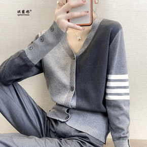 羊毛混纺2021秋冬新款女士宽松v字领拼色高腰四道...