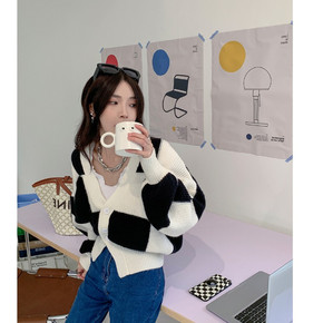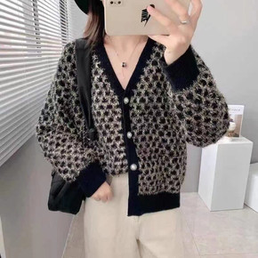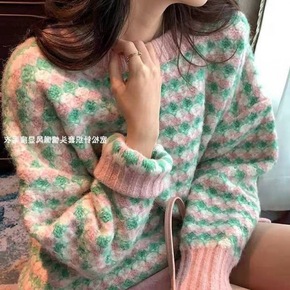2021秋季新款韩版复古撞色针织开衫少女厚实宽松格...