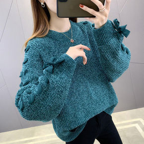 秋冬新款百搭慵懒风雪尼尔毛衣女套头宽松外搭蝴蝶结针...