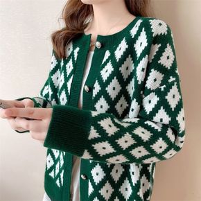 春秋新款外套毛衣女韩版菱形拼色针织开衫洋气百搭圆领...