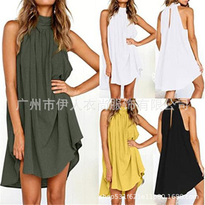 欧美女装夏日沙滩派对圆领褶皱无袖棉麻不规则背心连衣...