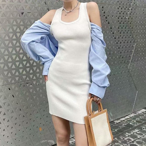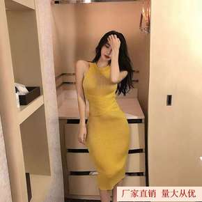 跨境女装2021现货性感无袖背心包臀裙单肩斜肩抽褶...