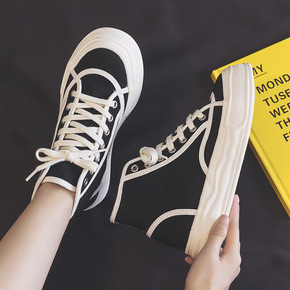 小香风女鞋2021秋季新款高帮厚底帆布鞋黑白拼色休...