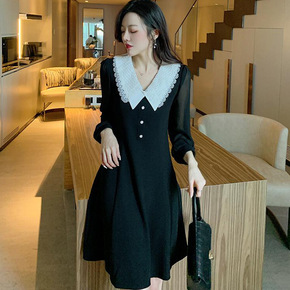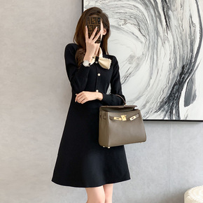 实拍实价新款法式复古赫本风撞色拼接小黑裙长袖收腰显...