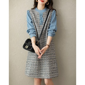 厂家直销秋季新款女装气质优雅a字格子长袖连衣裙女显...