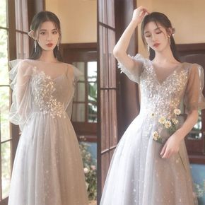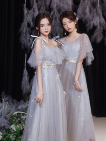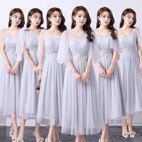伴娘服新款春季灰色艺考长款姐妹团婚礼小个子晚礼服...