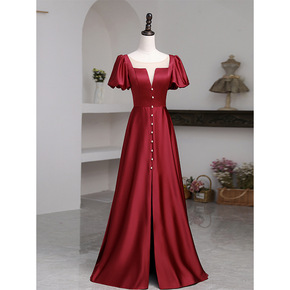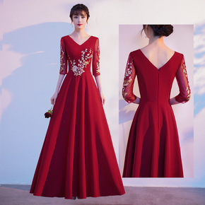 外贸缎面泡泡袖敬酒服酒红色深v领演出年会宴会晚礼服...