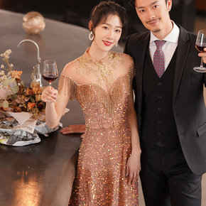 新娘敬酒服2022夏季宴会晚礼服女香槟色流苏气场演...