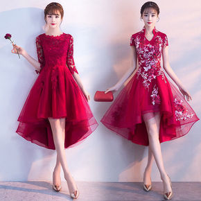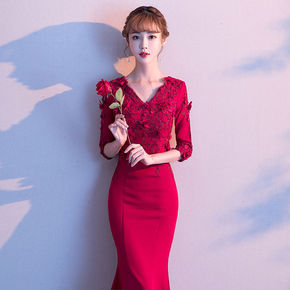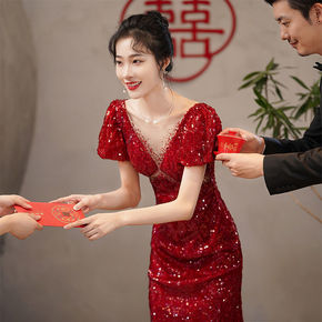 敬酒服新娘旗袍新款夏季酒红色礼服小个子结婚订婚鱼尾...