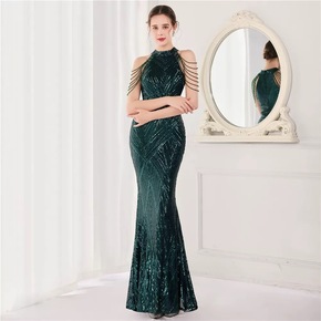 速卖通外贸2022新款晚礼服珠亮片宴会礼服长款挂脖...