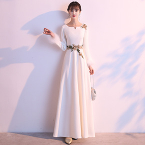 礼服女长款气质婚礼伴娘团长袖表演活动敬酒服主持人肉...