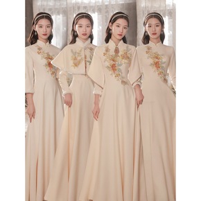 中式伴娘服2021新款冬季长袖香槟色婚礼姐妹团礼服...