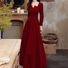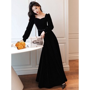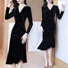 温柔风长裙法式黑色金丝绒礼服女新款秋冬包臀长裙优可...