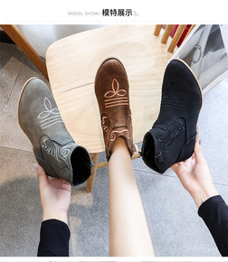 独立站2021跨境欧美秋冬新款方头玫瑰绣花切尔西短...