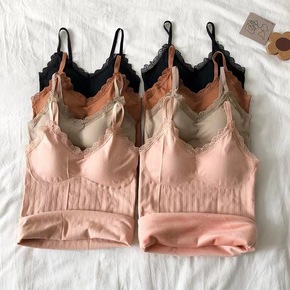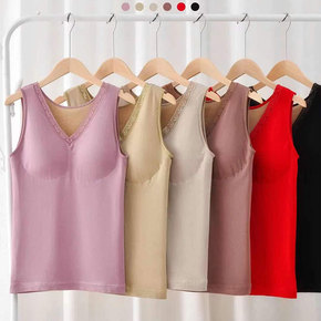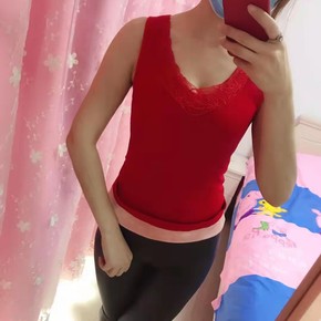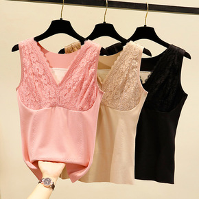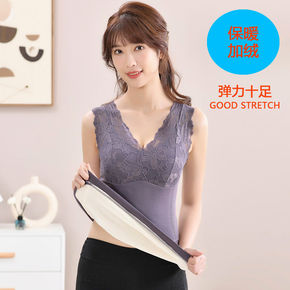保暖加绒加厚背心女V领冬季蕾丝拼接带胸垫内衣无袖打...