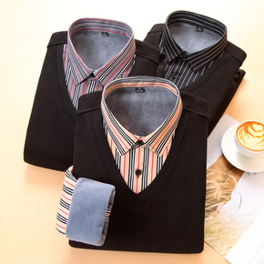新款秋冬季衬衫男假两件套头毛衣加绒加厚保暖衬衣马甲...