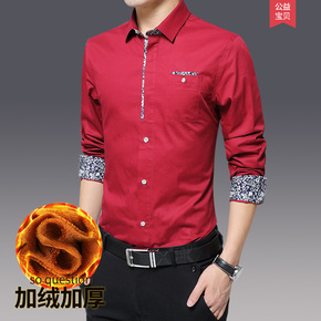 秋冬酒红衬衫男长袖保暖有口袋ls忖衫防皱大码本命年...