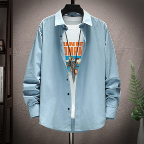 2022春季新款假两件男士衬衫青年韩版长袖翻领条纹...