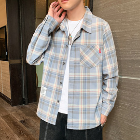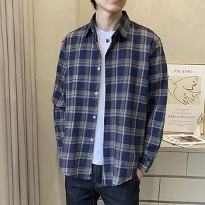 2022男士宽松格子衬衫外套春秋长袖衬衫休闲上衣韩...