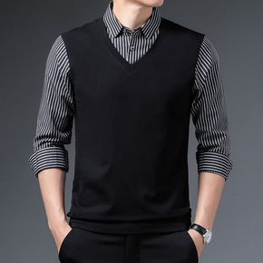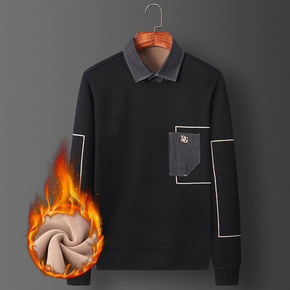 义深海新款长袖现货加绒加厚男士假两件针织衫个性兜纹...