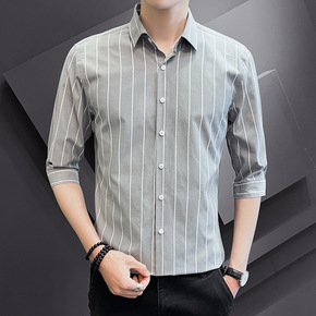 2022新款条纹衬衫男士短袖七分衬上衣春夏季商务修...