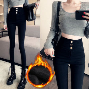 加绒2021秋冬新款高腰弹力裤子紧身长裤铅笔小脚加...