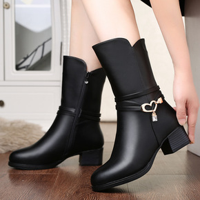 妈妈鞋棉鞋中筒靴子短靴秋冬季中年粗跟软底中跟皮鞋加...