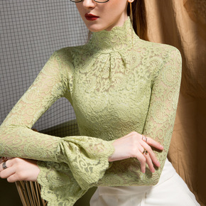 秋冬新款洋气蕾丝衫弹力高领打底衫女内搭喇叭袖仙气小...