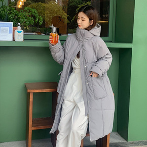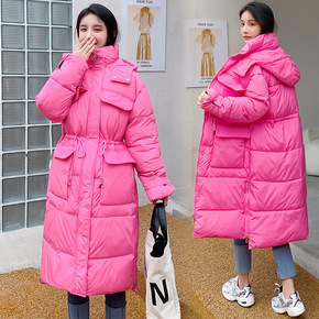 2022年新款欧美中长款棉衣女修身连帽抽腰棉服内加...