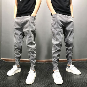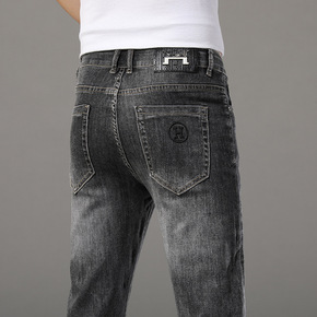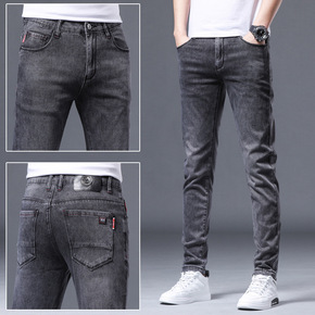 青年潮牌复古烟灰色外贸原单小脚牛仔裤男纯棉弹力修身...