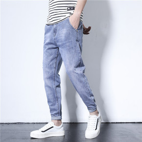 社会牛仔裤男夏季薄款八分宽松短裤破洞哈伦裤七分小脚...