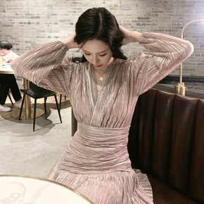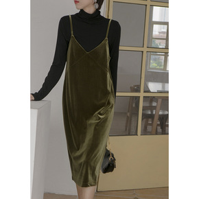 韩版秋冬季新款简约 休闲V领中长显瘦金丝绒吊带连衣...