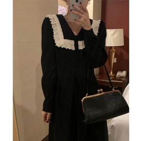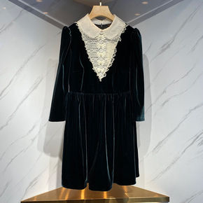 2021冬季新款女装气质娃娃领蕾丝高腰显瘦丝绒连衣...
