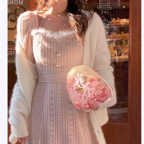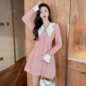 2021年新款秋冬季翻领泡泡袖气质裙子粉色显瘦小个...