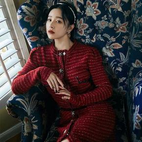 红色丝绒连衣裙女秋冬季2021新款法式小个子设计感...