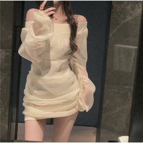 ~法式一字领抹胸修身欧根纱拼接透视袖子中长款...