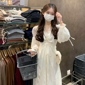 2022春装新款连衣裙白色温柔风法式长袖蕾丝裙子中...