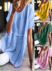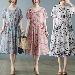 2022夏装新款文艺复古印花棉麻短袖连衣裙收腰系带...